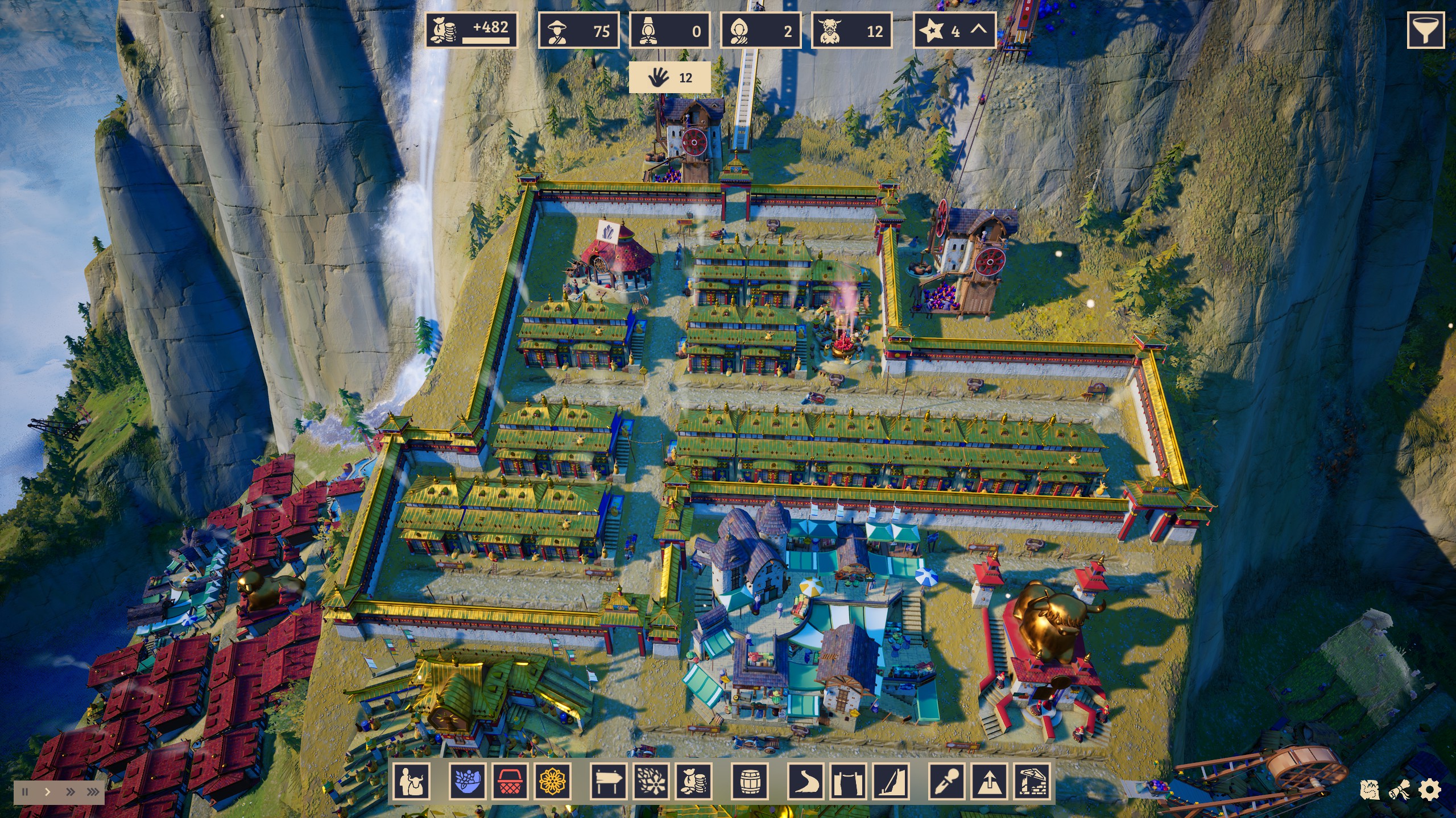 Nous reviendrons sur les chaînes de production, parlons des trois types d'habitation à votre disposition : les habitants des plaines, les artisans et les moines. Chaque caste a ses propres besoins, également répartis en trois catégories, la nourriture, la prospérité et la spiritualité. Globalement, les habitants des plaines s’occupent de la nourriture, les artisans produisent des objets pour la prospérité et les moines gèrent la spiritualité.