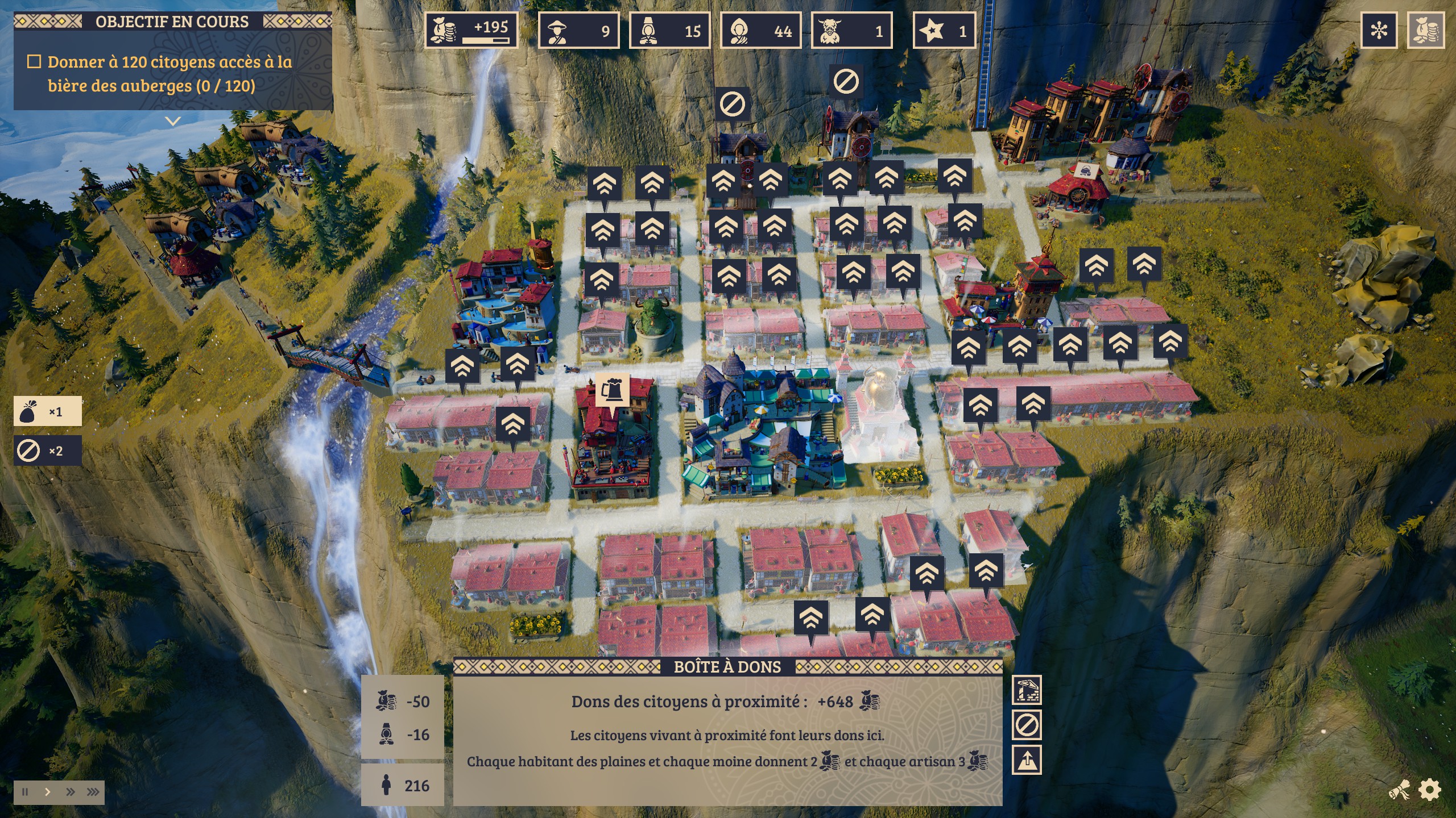Là où le jeu est malin, c’est que déplacer / détruire ne vous coûte vraiment pas grand-chose. La gestion de l’argent est plus une histoire de balance entre coûts et revenus qu’une question de montants. Le but n’est là aussi pas de gagner énormément d’argent, tant que vous êtes en positif, globalement, c’est bien. À peu près tous les bâtiments ont un coût d’entretien et vous avez plusieurs bâtiments pour vous permettre de générer des revenus.
